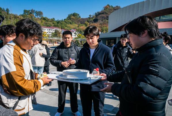 被誉为“城市文化客厅”的鹿鸣山文化院街,融合了传统意蕴与现代设计语言,如同一部立体教科书。师生们带着专业眼光观察思考,穿行于高低错落的院落之间,跟随衢州景富文创置业有限公司设计总监张鹤立的讲解,深度了解建筑的立面风格、传统工法与景观布局,领略不同风格元素与本地文化相融合的应用与魅力。 在烂柯山世界围棋公园,建筑工程学院何烨老师细致解析园区的整体规划理念——如何将围棋“天圆地方、黑白对立”的哲学思想转化为建筑与景观的形态语言。而后,大家步入展陈空间,仿佛进入了一个宏大的围棋世界。从布局的谋篇到细节的雕琢,从虚实的运用到阴阳的辩证,其设计无不体现着中华智慧的深邃。
