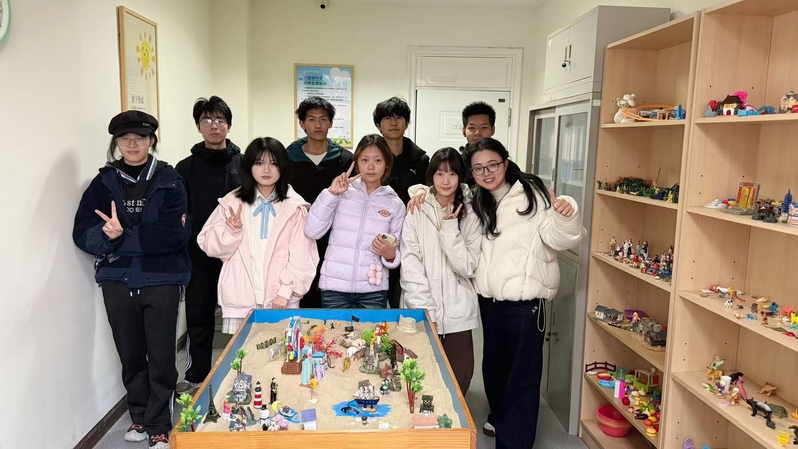 在面向低年级心理委员的团体活动中,培训以沙盘体验开始。在沈老师的引导下,同学们依次在沙盘中放置微缩模具,逐步构建出共同的场景雏形。每位参与者结合所选沙具的寓意与摆放思路分享感受,经过多轮调整与交流,最终共同完成一幅沙盘作品。作品被命名为“我们的奇幻世界”“星途慢行”等,传递出同学们对成长与人际关系的深入思考。随后的议题讨论环节,沈老师采用随机抽取纸条的形式,引导大家围绕“丰富校园活动”“学业资源利用”“生涯规划困惑”等贴近实际的话题展开交流。现场气氛热烈,同学们结合自身观察与实践积极发言,在互动中进一步深化了对心理健康工作的认识。