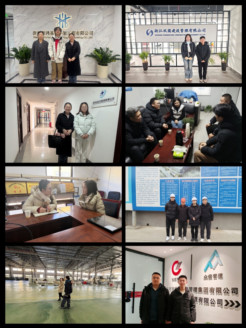 为深入贯彻落实高校毕业生就业工作部署,深化校企合作,拓宽就业渠道,同时加强对毕业生实习过程的指导与管理,2026年1月5日至1月7日,建筑工程学院组织四支调研小组,分赴浙江杭州、宁波、金华、衢州四地,集中开展实习巡视与访企拓岗专项活动。学院副院长孙亚丽、学工办主任沈丽娜、毕业班辅导员刘建飞、毕业班班主任何晓锐、方鑫鑫、黄庆、杨卓焯以及工管系教师王立娜等共同参与此次走访。